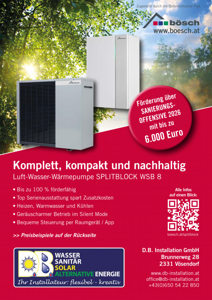 Sanierungsoffensive 2026!Registrierung und Antragstellung zur Sanierungsoffensive 2026 gestartet!Mehr Information erhalten Sie hier!In Zusammenarbeit mit der Firma BÖSCH haben wir ein Top-Angebot für Sie! Sie haben Interesse an einem Umstieg auf eine Luft/Wasser-Wärmepumpe? Kontaktieren Sie uns - wir beraten Sie gerne!